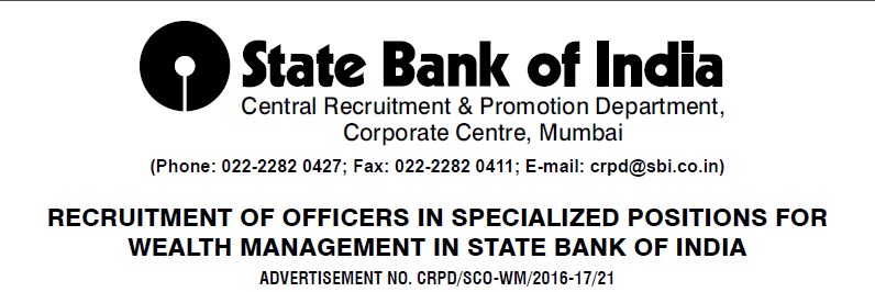 State Bank of India invites Online applications from Indian citizens for appointment in following Positions in Specialist Cadre for wealth management in State Bank of India on contract basis. Candidates are requested to apply Online through link given in careers section of Bank’s website www.statebankofindia.com or www.sbi.co.in.